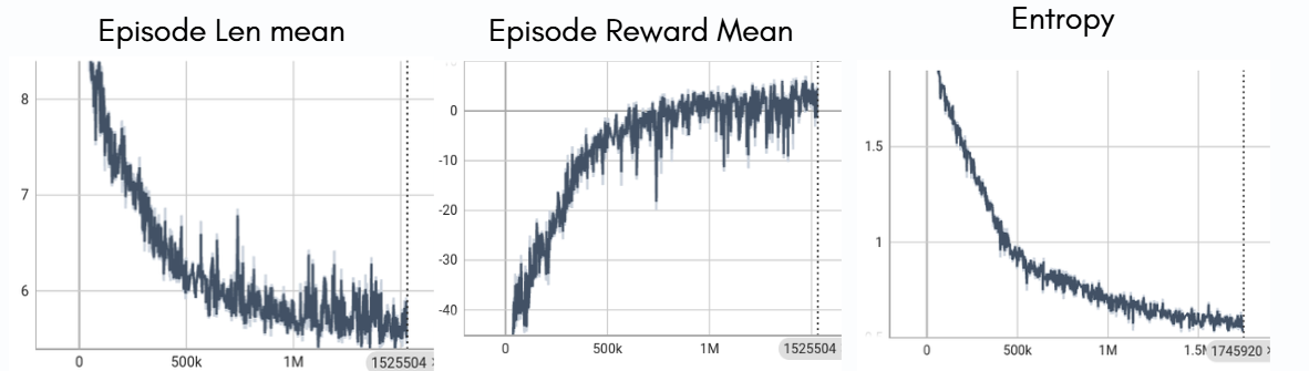 We choose PPO as the base policy. The training logs for both the single-agent and multi-agent settings are shown below. In the single-agent setup, the decreasing training loss and the explained variance approaching 1 indicate stable convergence and accurate value function estimation. In the multi-agent setup, shorter episode lengths, higher cumulative rewards, and lower policy entropy demonstrate improved efficiency and increased confidence in cooperative decision-making. As training progresses, agents reduce redundant movements when visiting plants and learn to adapt their actions in response to the behaviors of other agents.