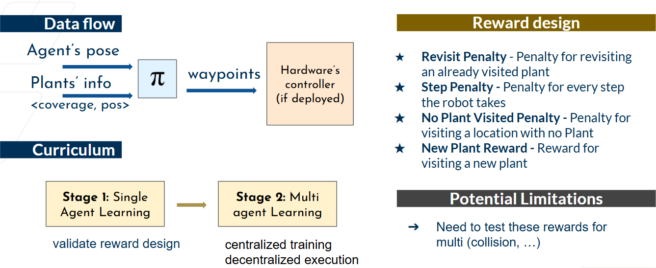 We developed a two-robot cable-driven system, each equipped with a distinct sensor (RGB and hyperspectral), to collectively capture comprehensive plants data over time. We then implemented a reinforcement learning framework to optimize coverage strategies and inter-robot coordination.