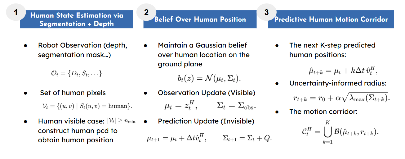 The human is treated as a dynamic, non-cooperative agent with unknown intent. Using segmentation and depth observations, we estimate the human’s ground-plane position when visible and maintain a Gaussian belief over their location when occluded. This belief is propagated forward using a constant-velocity model, capturing uncertainty due to sensing noise and intermittent visibility.