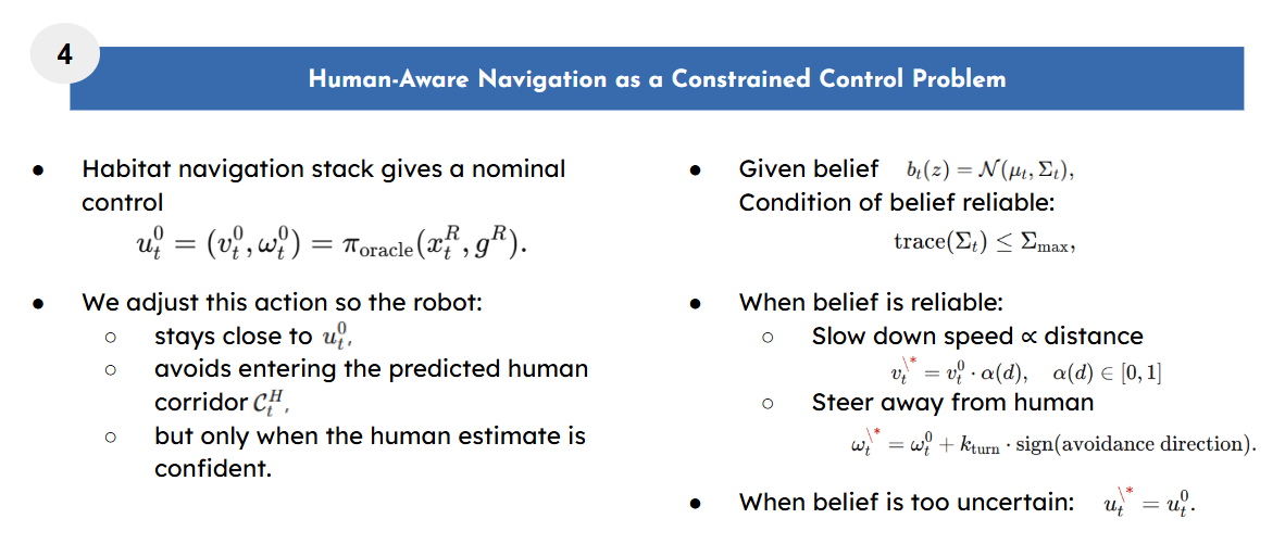 The robot follows the oracle navigation command by default and intervenes only when necessary. If the robot approaches the predicted human corridor within a safety margin, the control is smoothly modified by slowing down and steering away from the human. Otherwise, the original oracle action is preserved. This constrained control strategy ensures safety and social comfort while maintaining goal accuracy and efficiency.