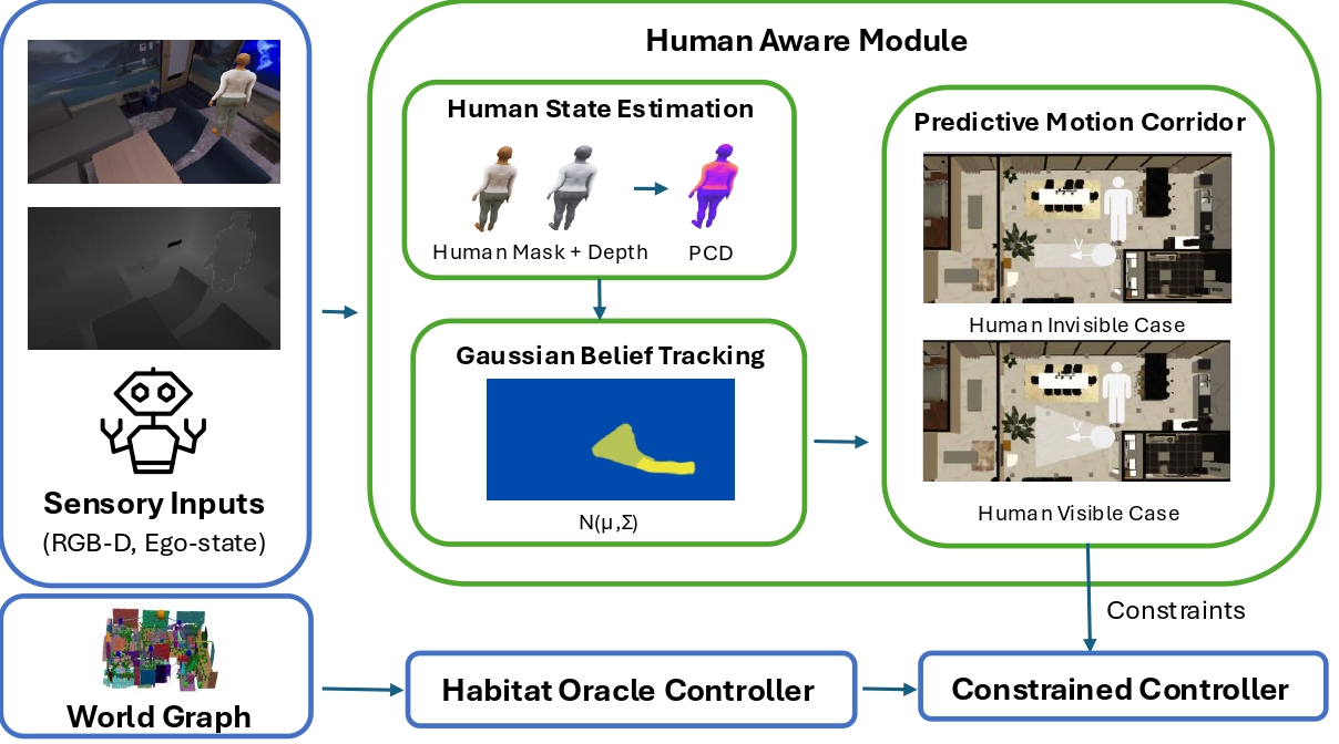 We evaluate our human-aware navigation framework in the Habitat 3.0 simulator using PARTNR benchmark assets. Experiments are conducted in a high-fidelity apartment environment containing realistic furniture and a simulated human performing household tasks.