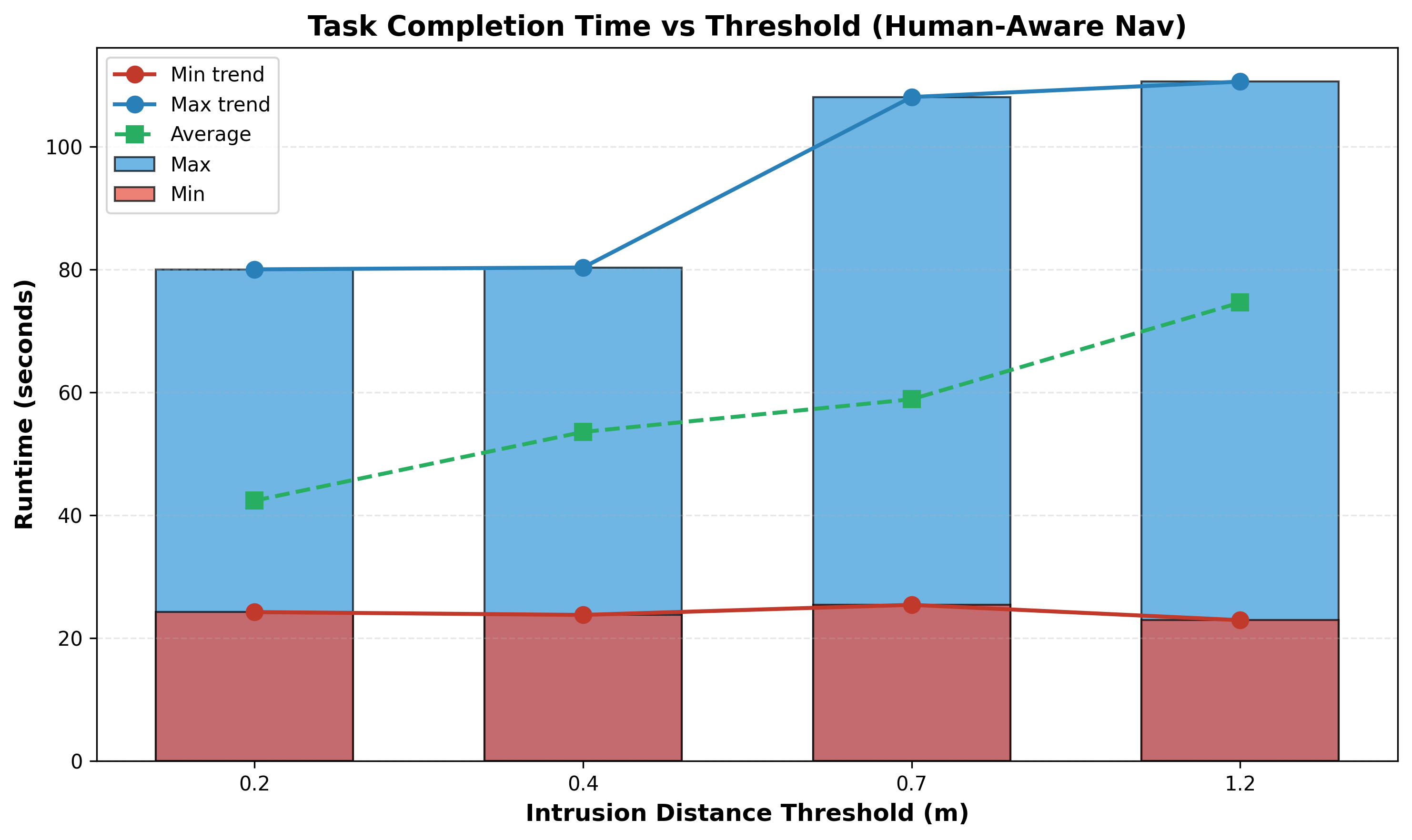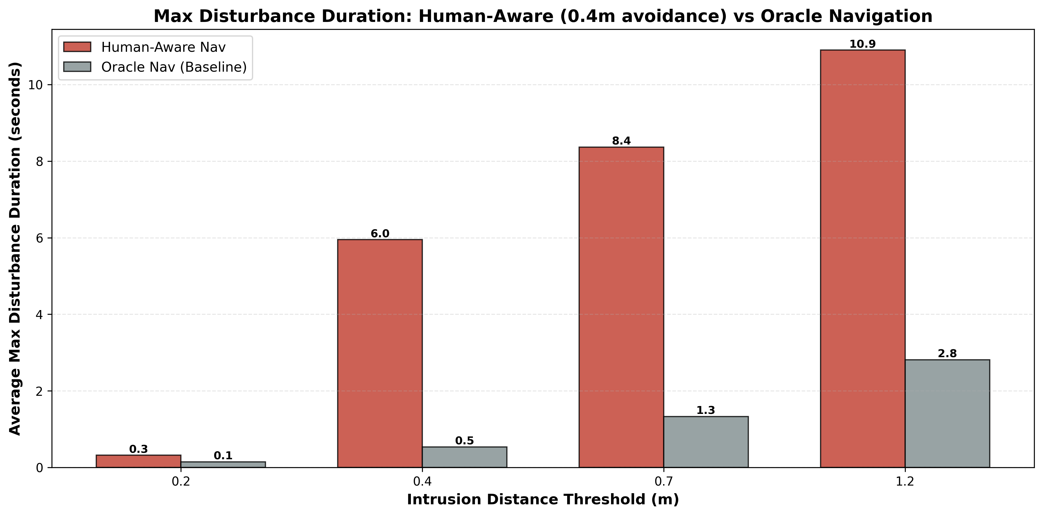 - Disturbance Count: number of robot intrusions within distance thresholds {0.2 m, 0.4 m, 0.7 m, 1.2 m}.